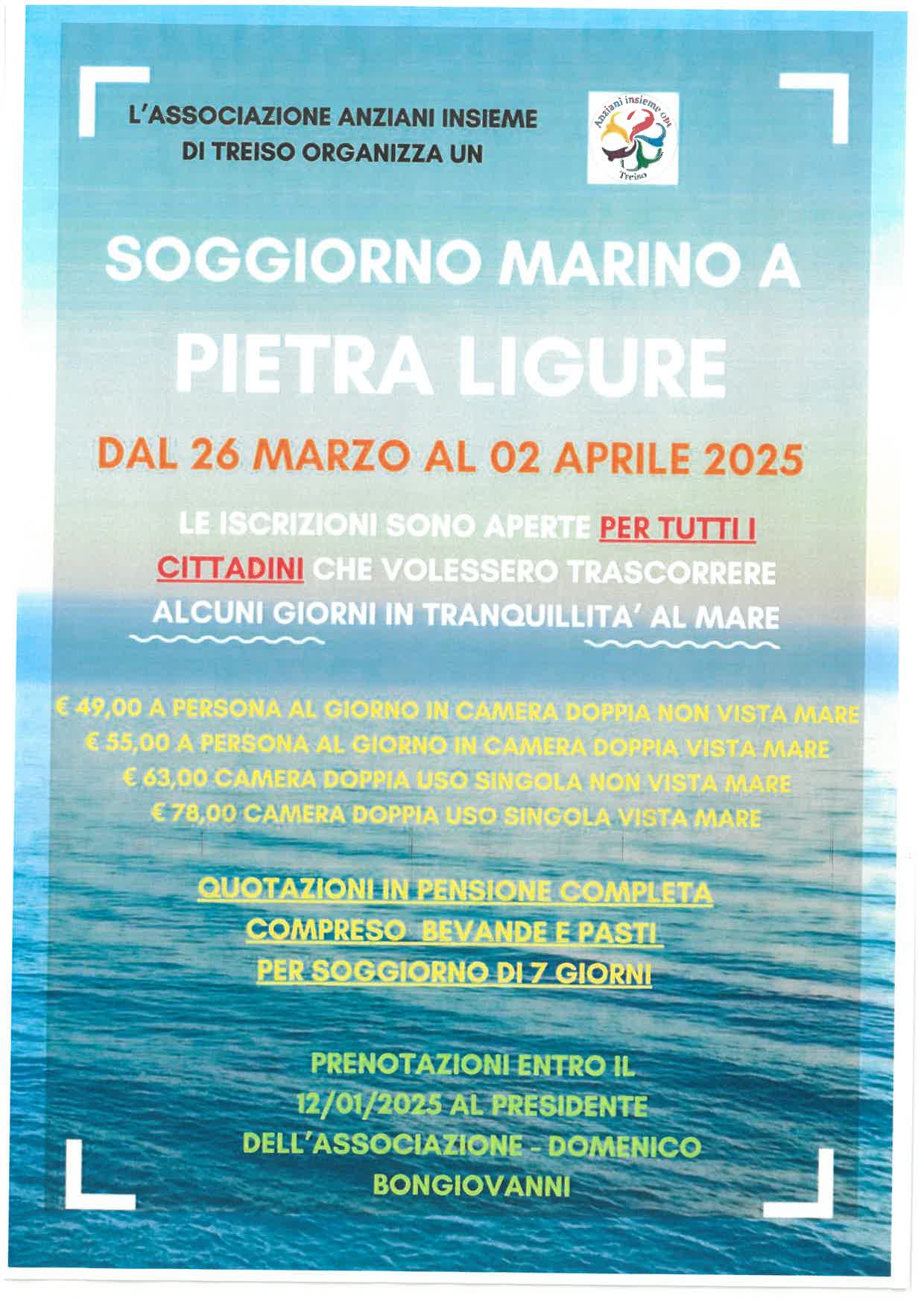 L'Associazione Anziani Insieme di Treiso organizza un soggiorno marino a Pietra Ligure dal 26 marzo al 02 aprile 2025